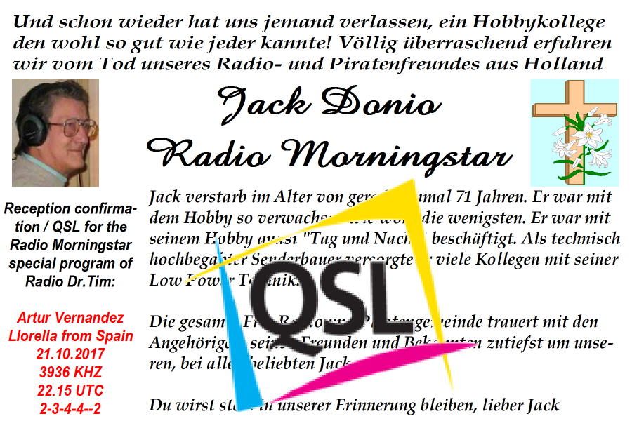 Dienstag, Dezember 19th, 2017Hi dear Gabriel (a german name and also your Family Name is from Germany!) Many thanks for your first Report including the audio clip to the station. Radio Dr.Tim is a rare Station mostly on 48 MB (6200-6400 KHZ). More Infos about Dr.Tim you can find on the Homepage http://www.doctortim.de/. I hope you like the first QSL from the „Pirate Doctor“. Radio Dr.Tim has div. QSL’s, also special Christmas QSL’s. For all reports from a listener our Station sends out a new/other QSL Moti